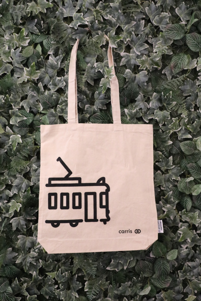 Saco de pano com ilustração de elétrico estilizada impressão a preto.  Tote Bag exclusivo da CARRIS, aliando a tradição à modernidade. Dimensão standard.